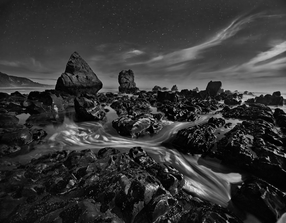 When we arrived at the beach, it was still very dark night. I quickly set up my camera in the spot that I had identified last evening, and started shooting. It was a super test of my patience to make this image during the two hours of witnessing an incredible transition between night and day. Luckily, by sunrise, the light made the rock wall shinning.