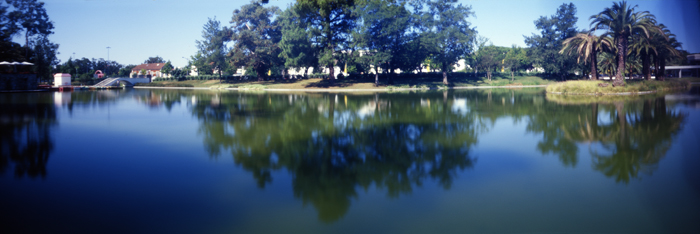 First there is the curved film plane, giving it an identity like no other. What it does is keeping the light on the film plane at exactly the same distance from the pinhole all around the frame, avoiding this way the usual vignetting seen with flat planes.